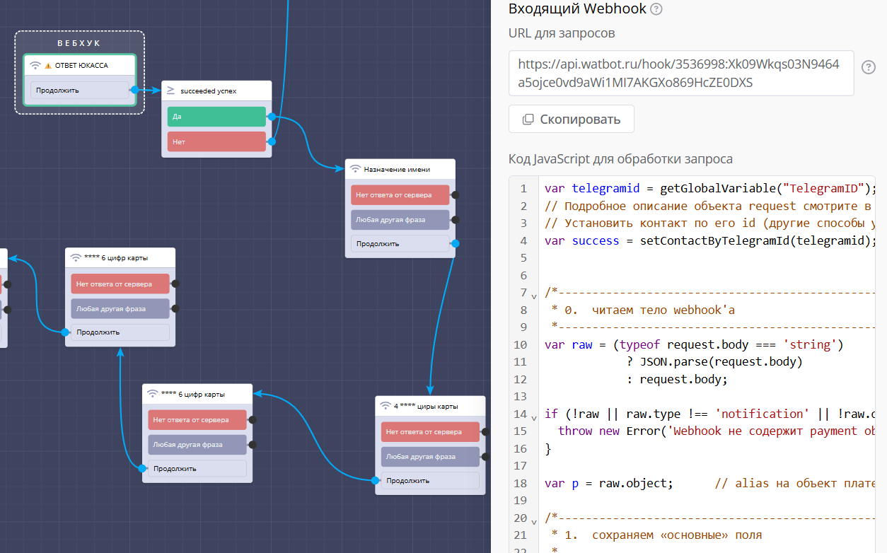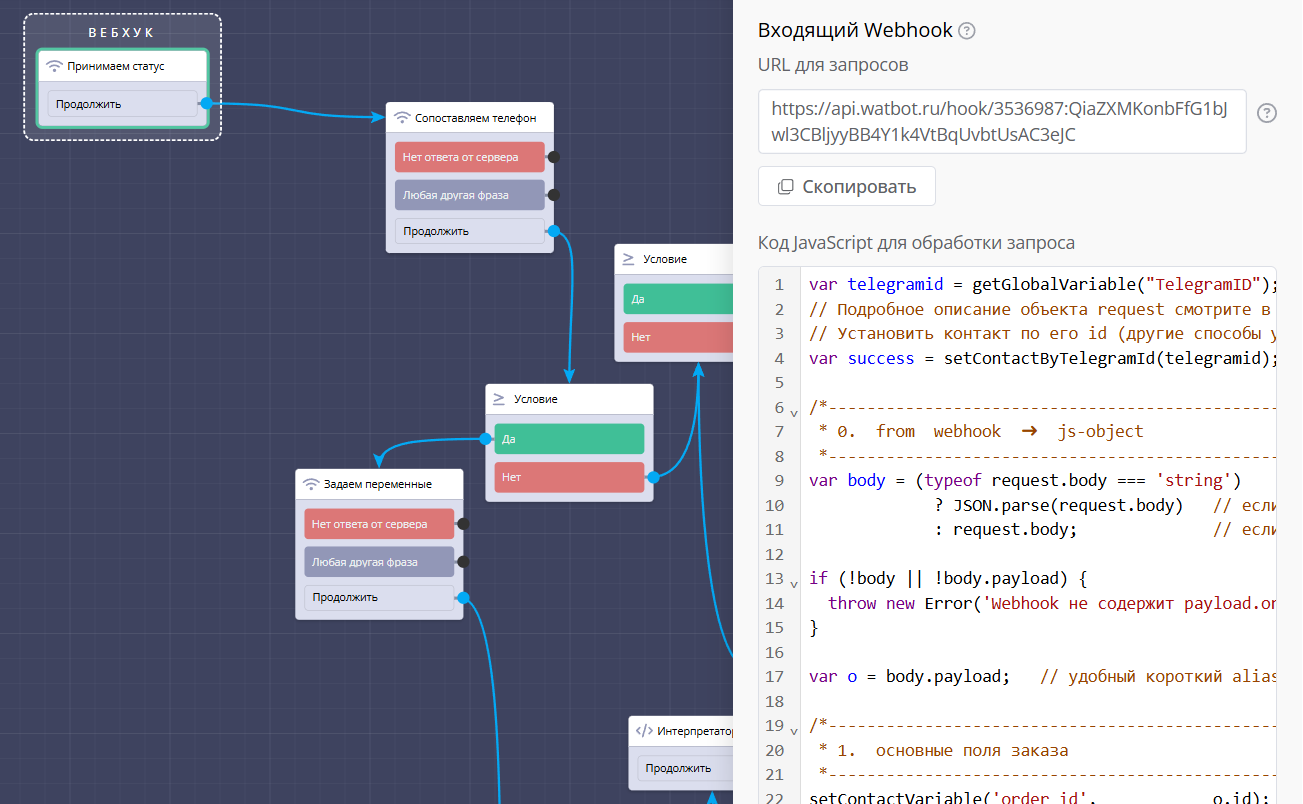 Входящий Webhook — это блок, созданный для приема HTTP-запросов от сторонних сервисов и их обработки с помощью языка программирования JavaScript на платформе Watbot.ru.
