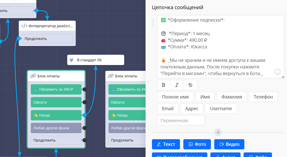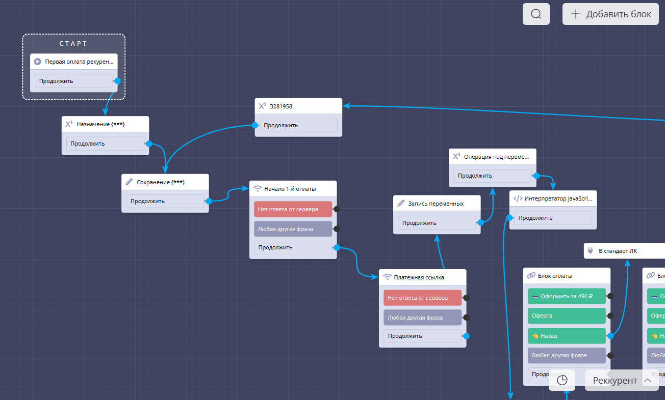 Первый блок — «Операция над переменной». Здесь записываются произвольные значения в переменные, необходимые для дальнейшей обработки платежа.