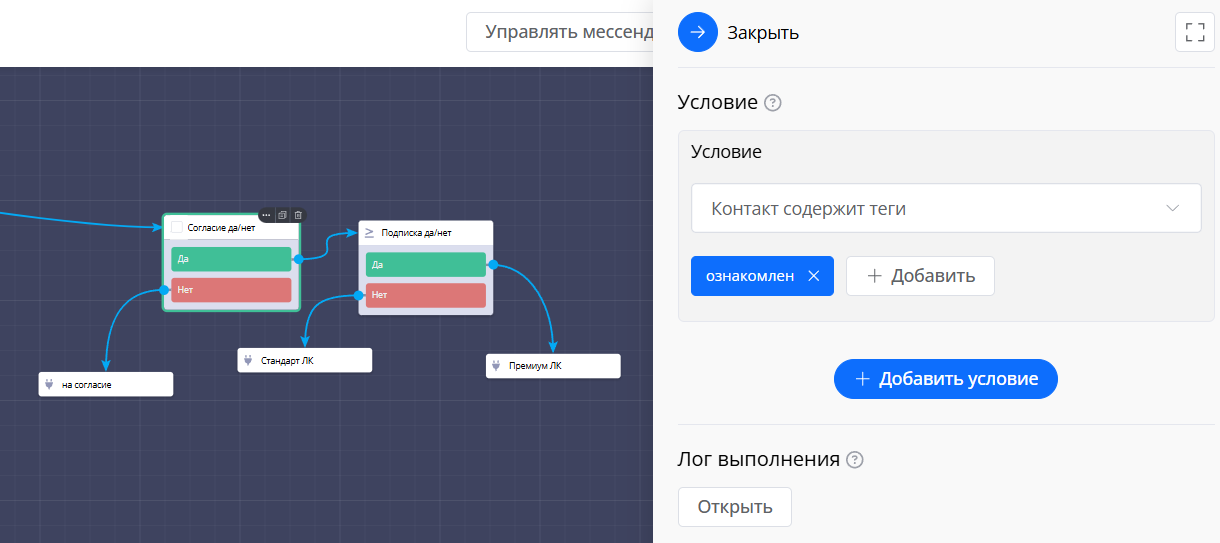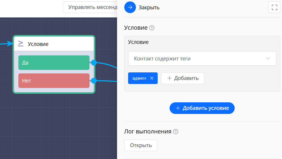 Первая проверка: содержит ли контакт тег «админ»? Если да — пользователь переходит в специальный сценарий. Если нет — движемся дальше.