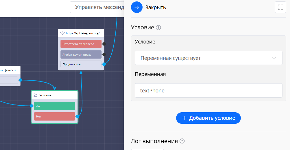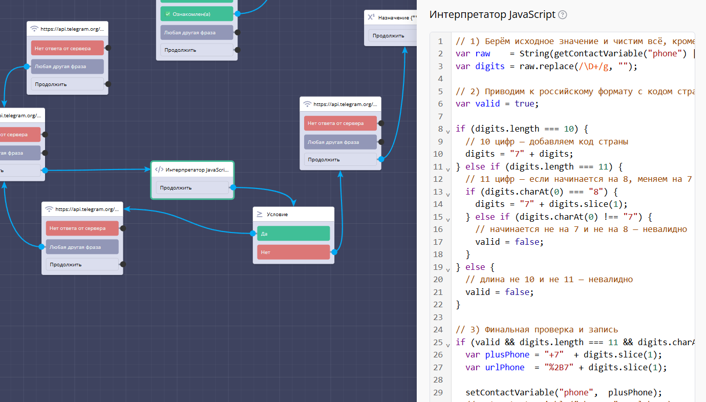 Блок «Интерпретатор JavaScript» обрабатывает полученный номер телефона с помощью кода.