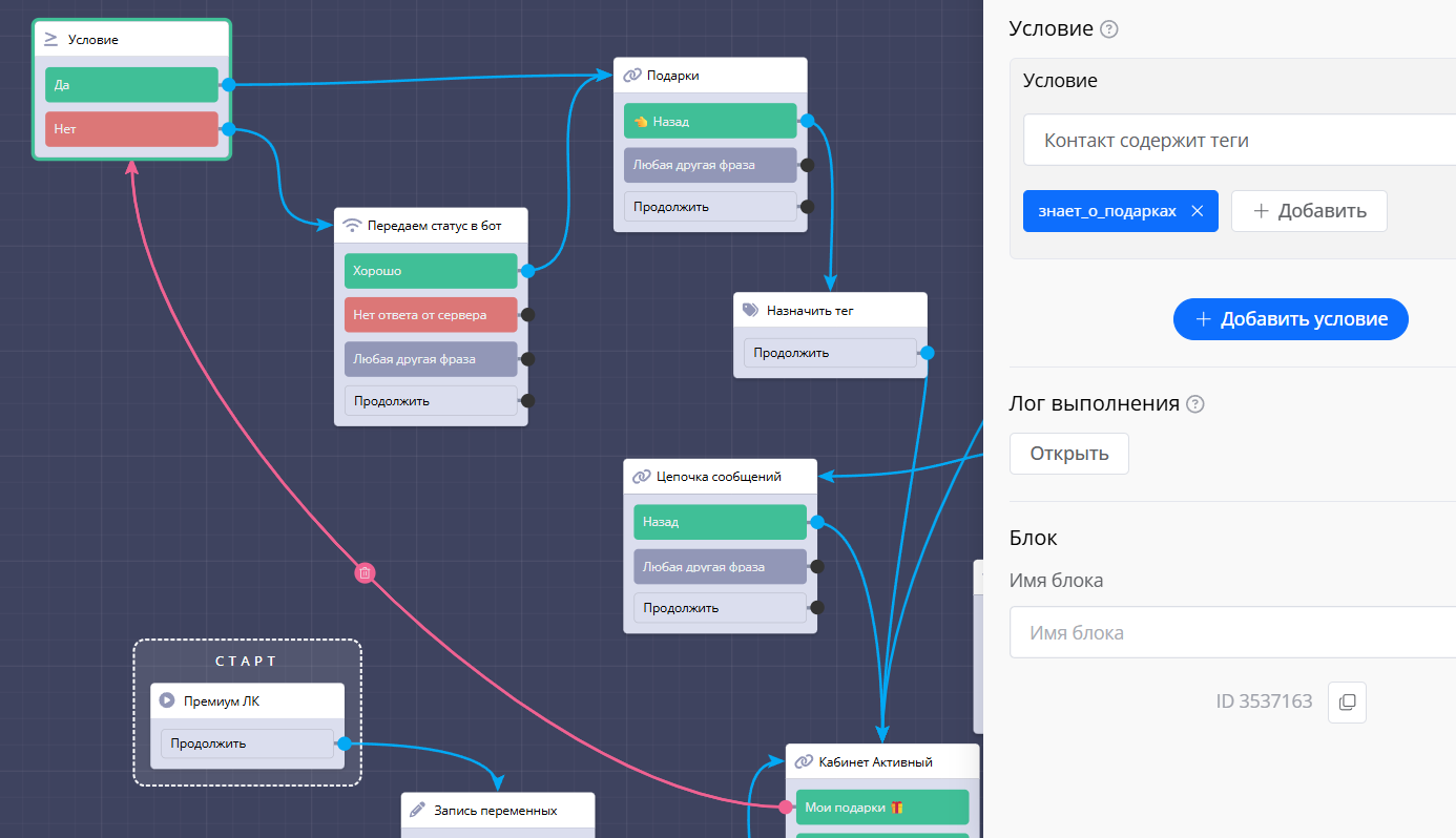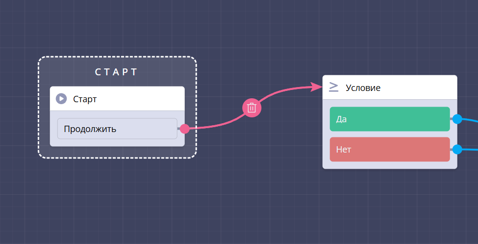 Связи между блоками отображаются синими стрелками и показывают логику движения по сценарию. Чтобы удалить связь, наведите курсор — она станет красной — и нажмите на значок корзины.