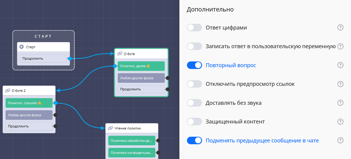 Обратите внимание на важную настройку в этих блоках. В разделе «Дополнительно» каждого блока включена опция «Подменять предыдущее сообщение в чате».