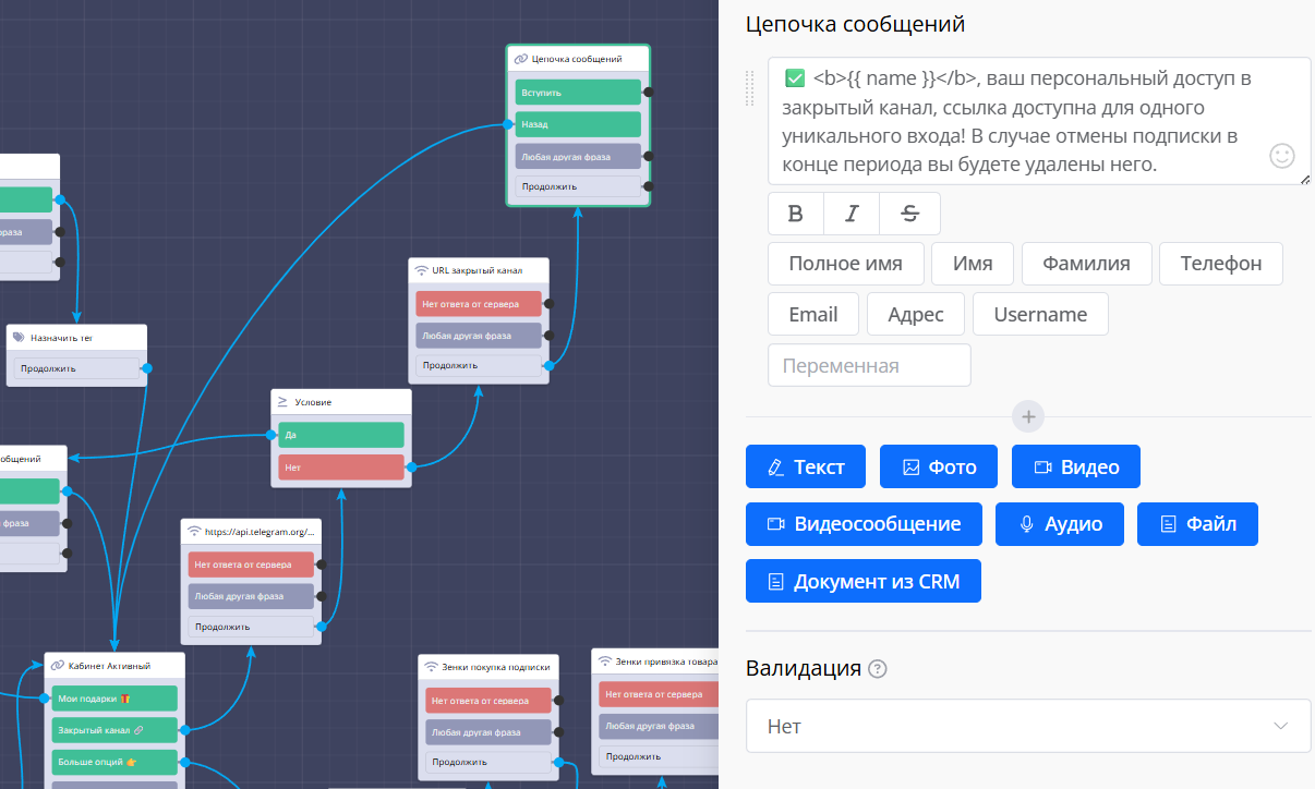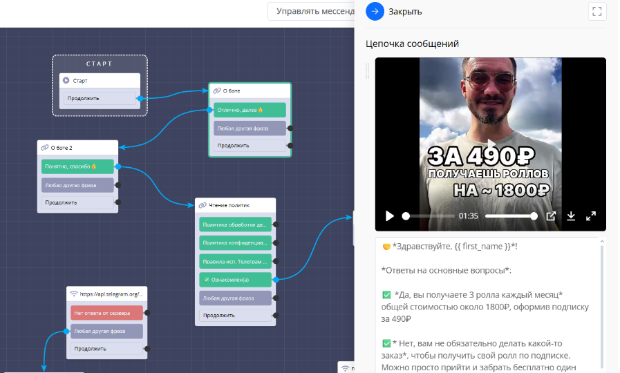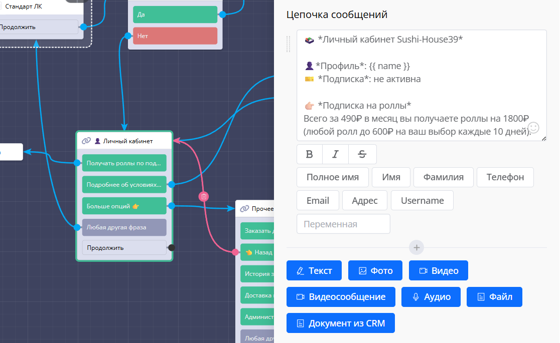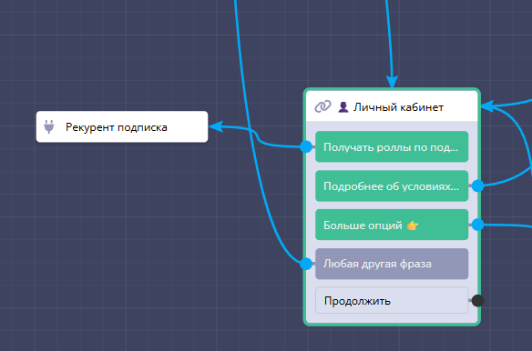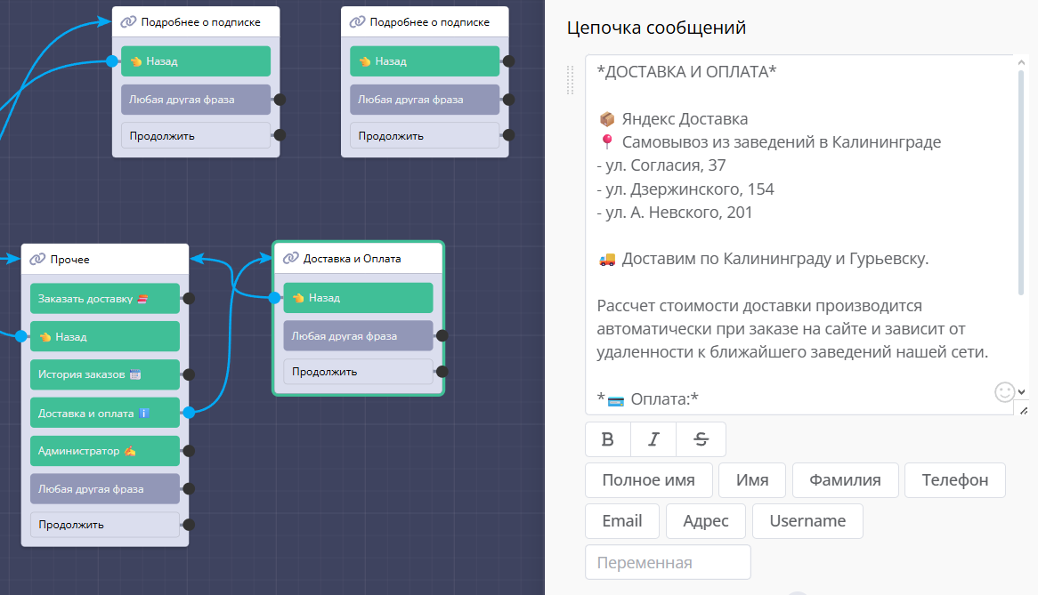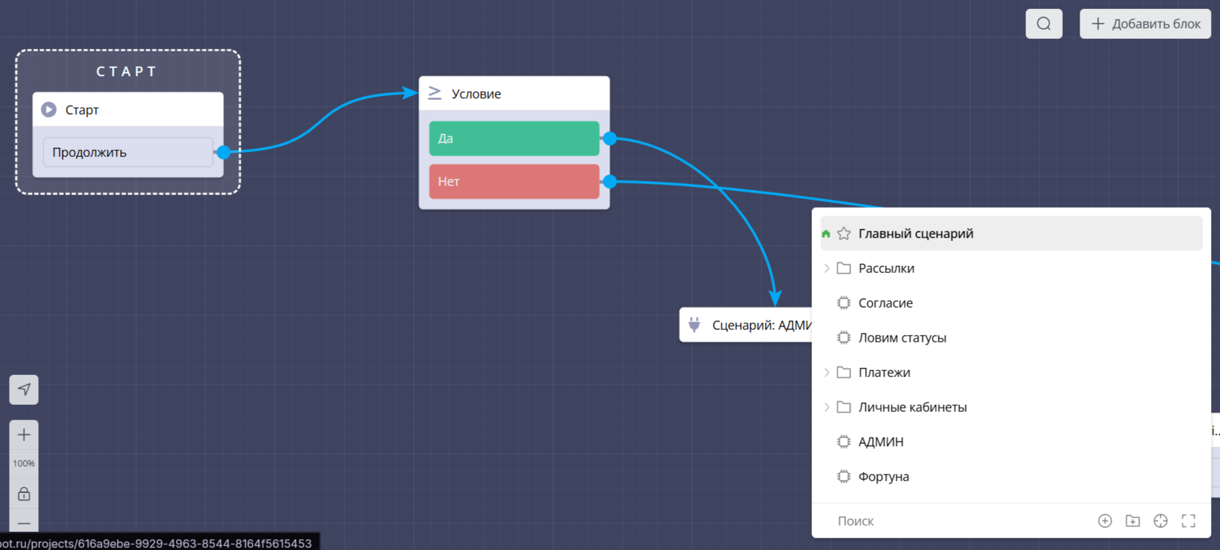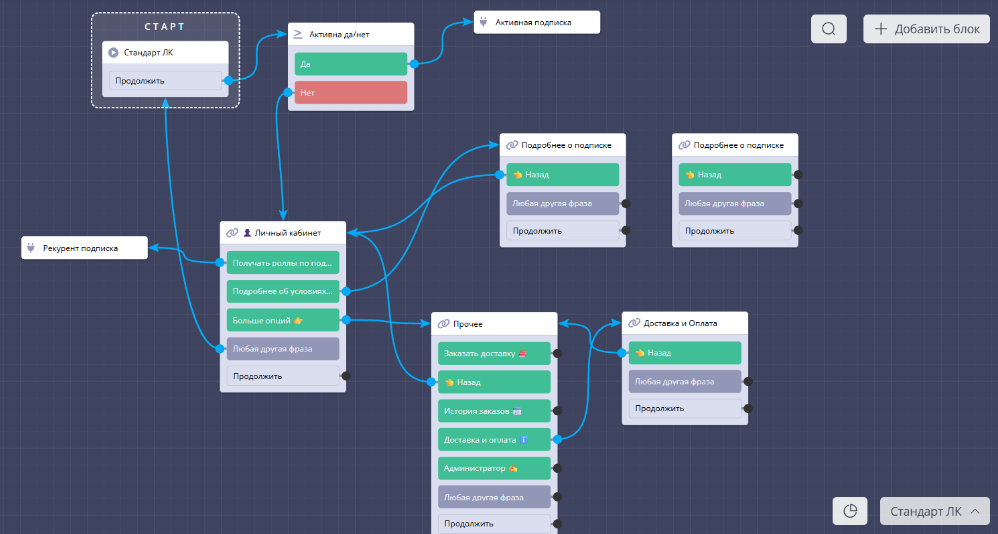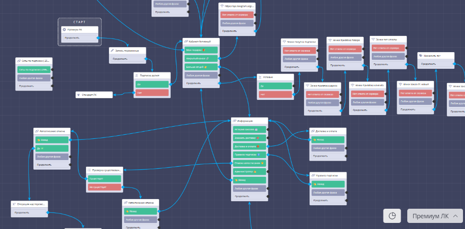 Некоторые сценарии даже объединены в папки для удобства навигации: личные кабинеты, процессы подписки, обработка заказов и так далее. Это делает работу с ботом намного проще — не нужно прокручивать бесконечное полотно блоков, можно быстро найти нужный сценарий.