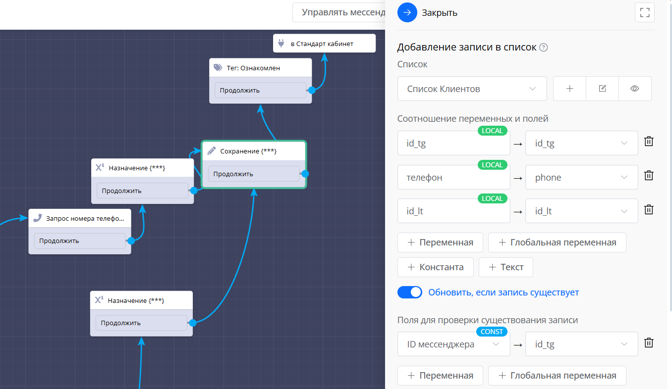После успешной валидации данных выполняется «Добавление записи в список» с названием «Список клиентов». Все переменные с данными пользователя записываются в этот список — по сути, создается профиль клиента в базе данных бота.