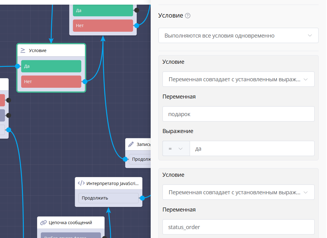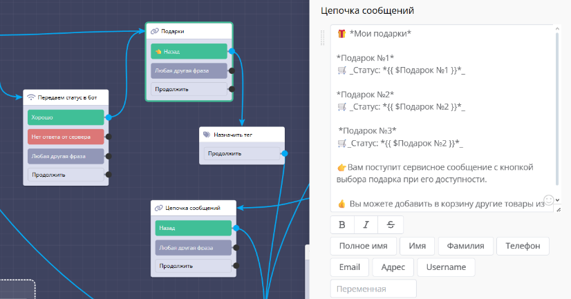 Если переменной с подарком нет, проверяется наличие следующей переменной. Если и её нет, выполняется блок «Конвертация телефона» — приведение номера к стандартному формату для корректного сопоставления.