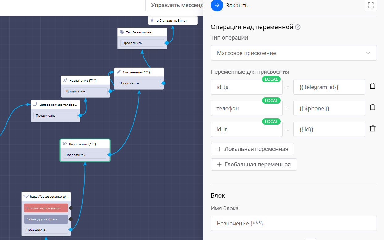 Если переменной нет (номер корректный), запускается блок «Операция над переменной», где данные пользователя сохраняются: