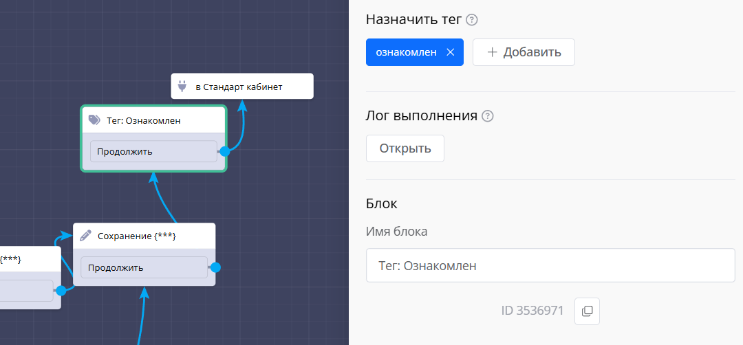 Затем пользователю назначается тег «Ознакомлен». Этот тег будет использоваться в условиях для определения статуса пользователя.