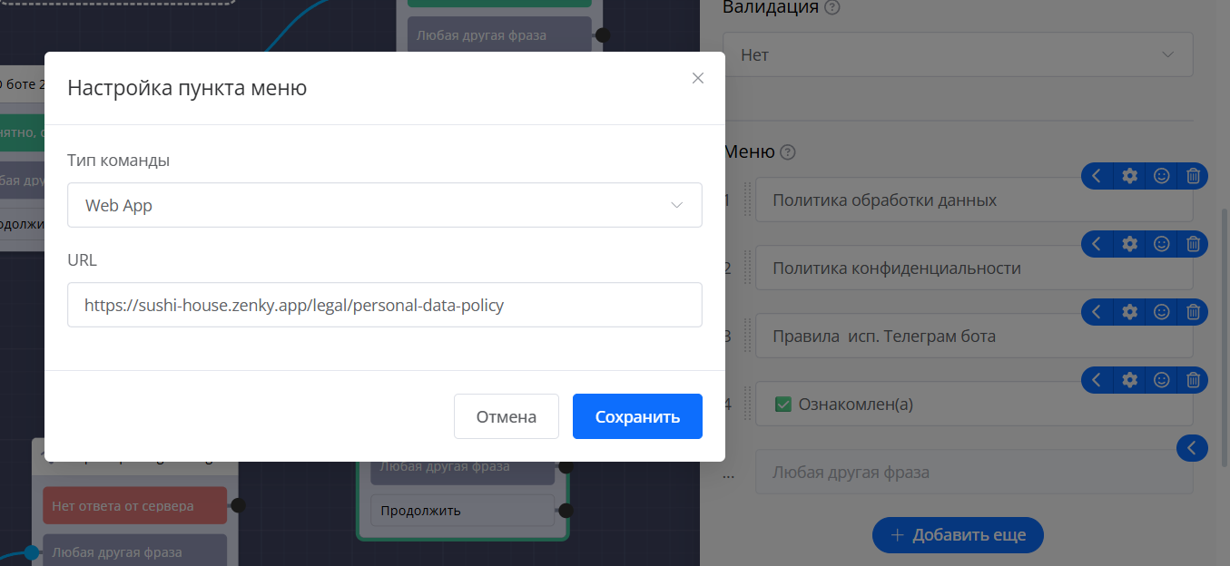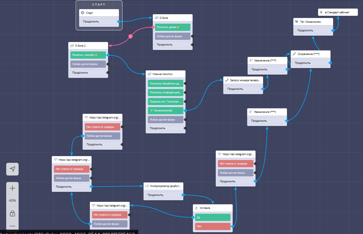 Вторая проверка: ознакомлен ли контакт с соглашением об обработке данных? Если пользователь впервые зашел в бота, он еще не давал никаких согласий, поэтому отправляется в сценарий ознакомления с политиками.