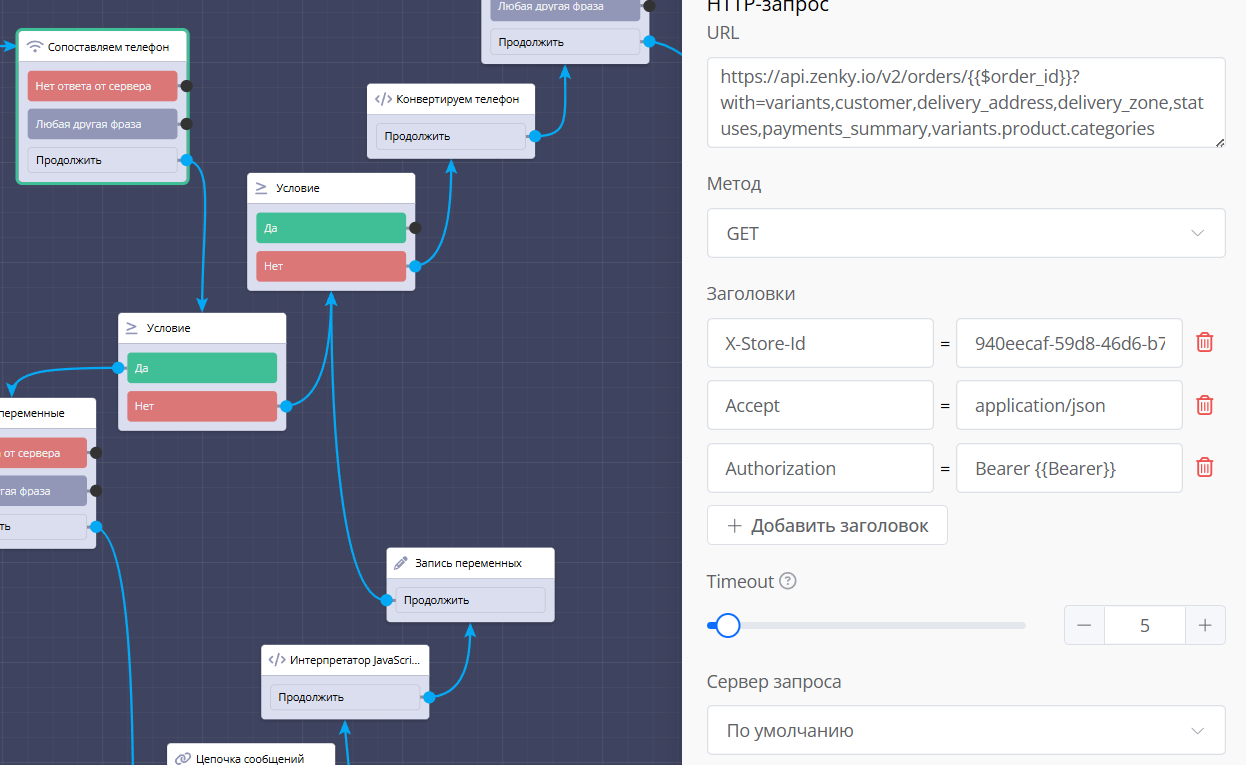 После получения данных о заказе нужно определить, какому пользователю отправить уведомление. Для этого используется блок HTTP-запрос с методом GET.