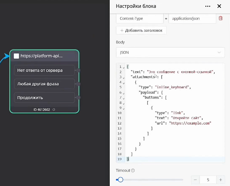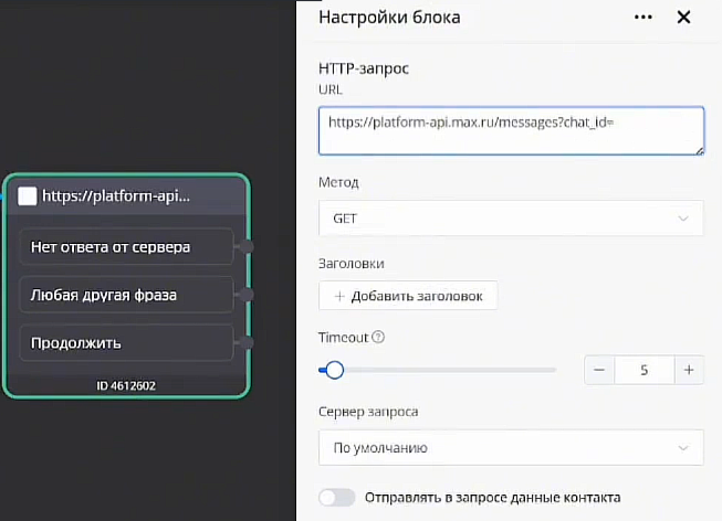 Добавьте третий блок — Цепочка сообщений. Проведите связь от блока HTTP-запрос к нему.