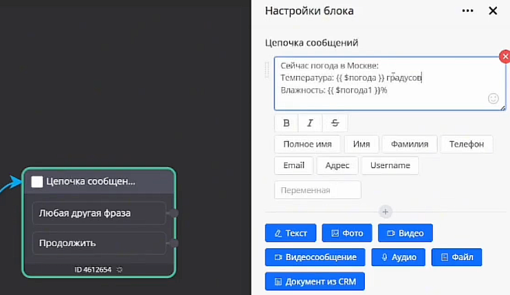 Для первичной проверки включите в блоке HTTP-запрос опцию «Вывести тело ответа в чат», сохраните сценарий и отправьте боту команду. В чат придёт длинная строка JSON.