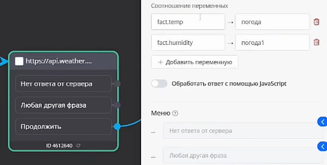 Вернитесь в блок HTTP-запрос. Отключите «Вывести тело ответа в чат» и включите «Записать ответ JSON в переменные».