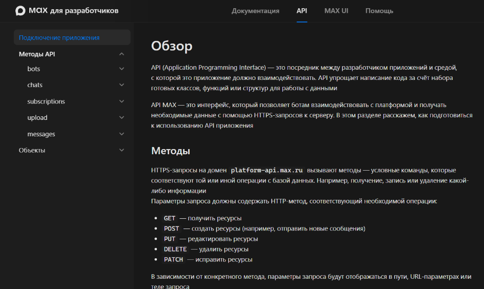 Перейдите в официальную документацию мессенджера Макс. Документация полностью на русском языке.