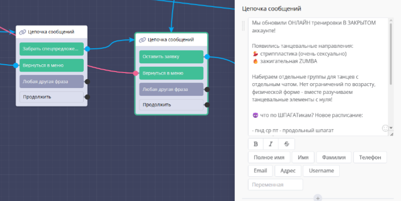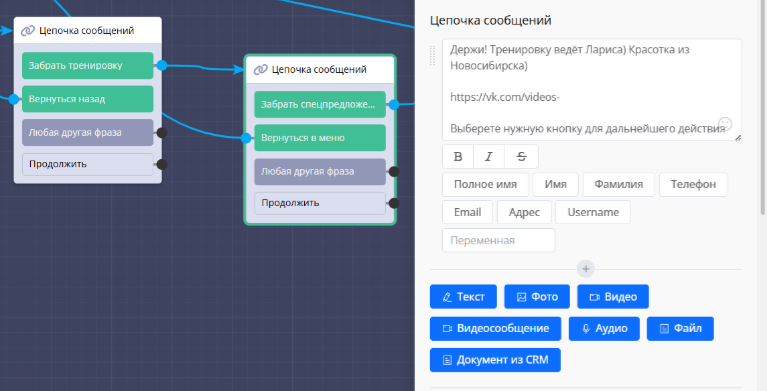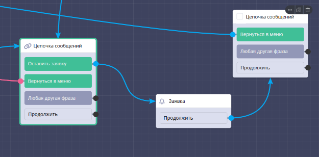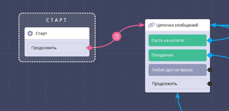 От стартового блока проведите связь к блоку «Цепочка сообщений».
