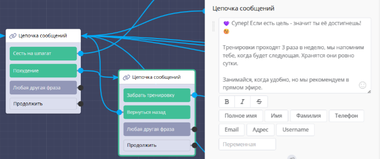 1. Построение разветвлённого сценария с двумя целевыми ветками (шпагат и похудение).