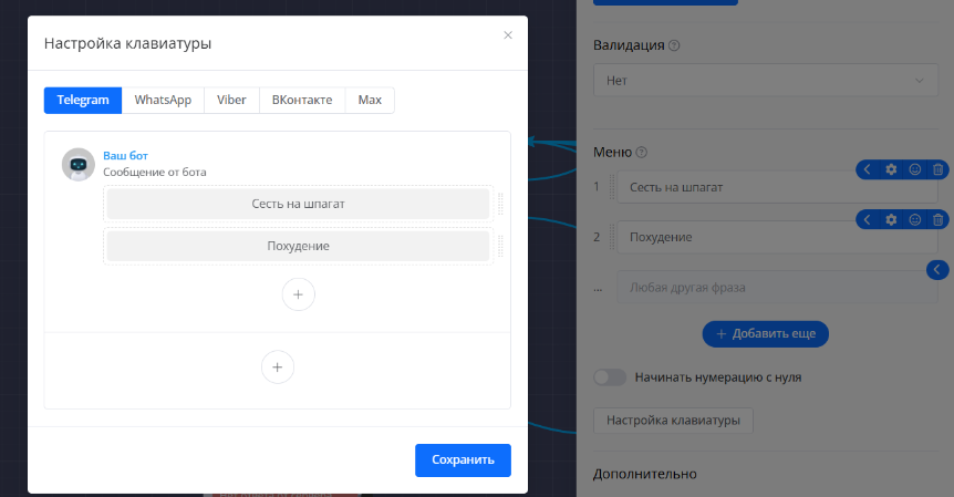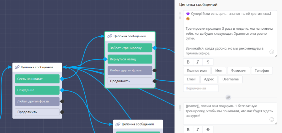 Сегодня создадим чат-бота для онлайн-студии растяжки и тренировок по похудению с нуля: соберём сценарий с выбором цели (шпагат или похудение), настроим выдачу бесплатной пробной тренировки как лид-магнит, добавим спецпредложение для конверсии в покупку, подключим бота к Telegram и Tam-Tam, сравним работу в двух мессенджерах и разберём получение токенов в каждой платформе. Весь процесс займёт 30-40 минут, а результат — работающая воронка продаж 24/7.